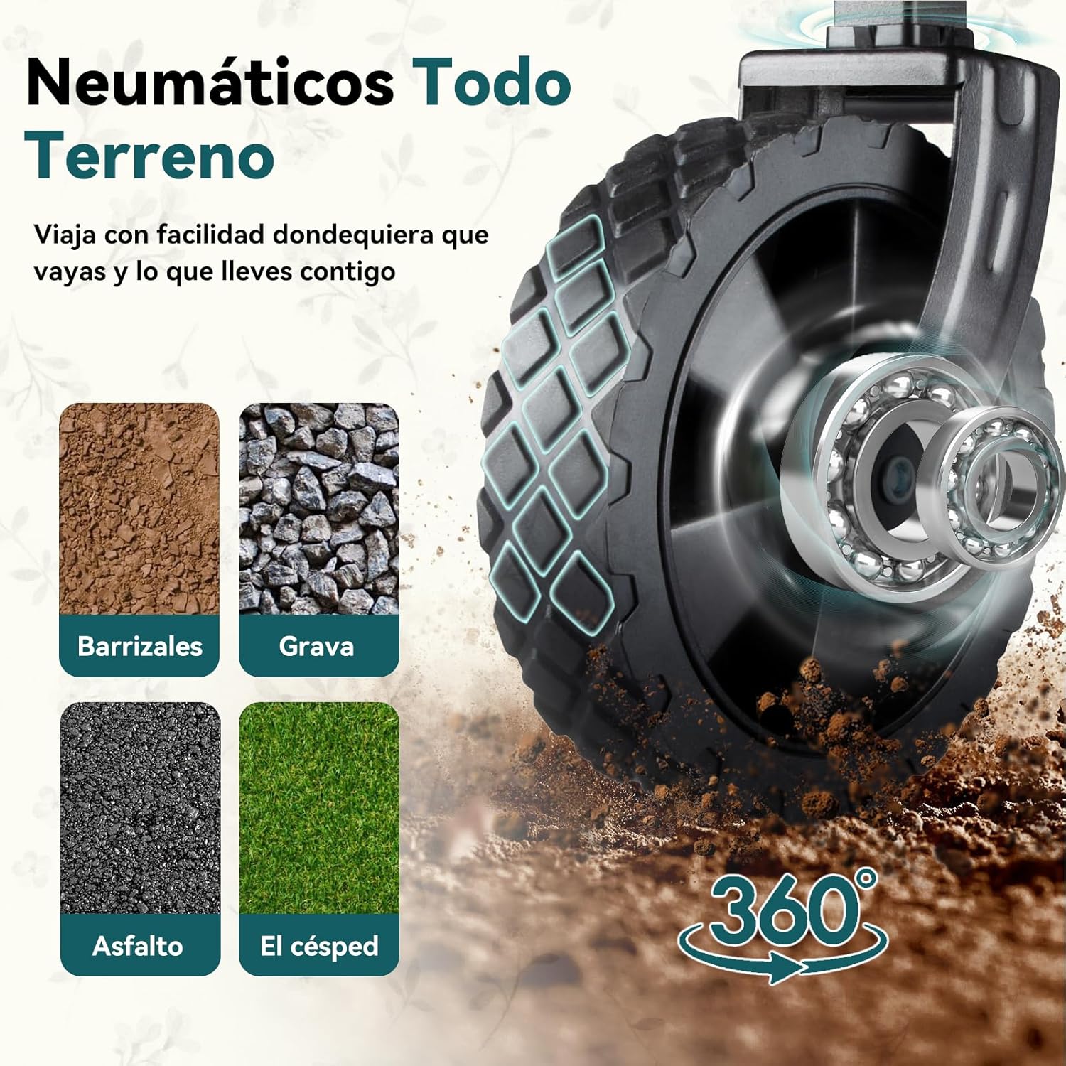 Diseñado para un transporte fluido, incluye ruedas delanteras giratorias de 360° que facilitan la maniobrabilidad del carrito. Es adecuado para diversos terrenos, garantizando un desplazamiento suave en diferentes condiciones. -