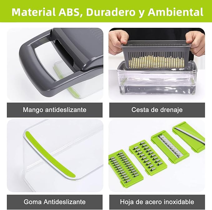 - 8 Cuchillas Intercambiables: Incluye cuchillas para rebanar, picar y cortar en dados, adaptándose a diversas necesidades.