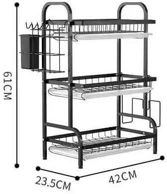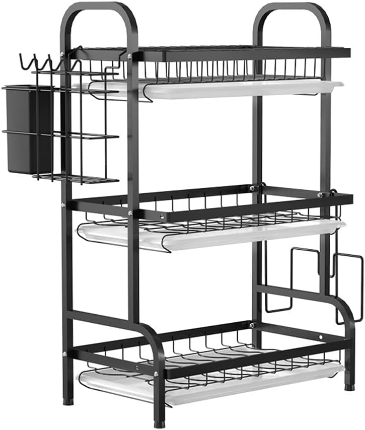 · Gran capacidad de 3 niveles: incluye escurridor para platos, soporte para utensilios, soporte para cuchillos y cubiertos, soporte para tabla de cortar y 3 bandejas de drenaje extraíbles; puede contener hasta 17 platos en el nivel superior y cuencos, tazas, sartenes, ollas y botellas en los niveles inferiores.